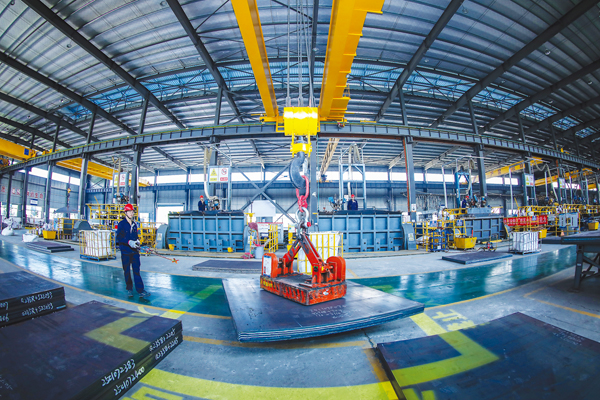 圖為復合板埋弧焊接作業完成吊裝下線。