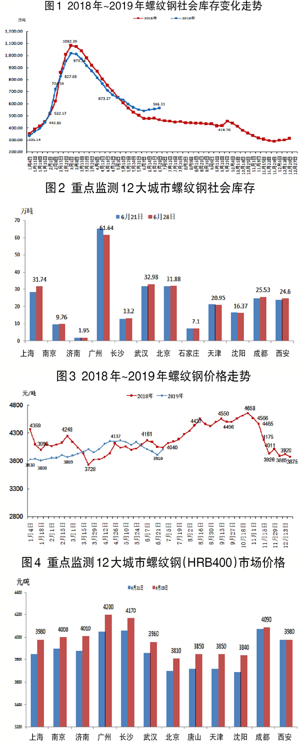 6月24日~6月28日,全國(guó)螺紋鋼平均價(jià)格為4002元/噸,環(huán)比上升92元/噸,升幅為2.35%。重點(diǎn)監(jiān)測(cè)的12個(gè)城市價(jià)格均上升,其中廣州、沈陽(yáng)等城市上升較大。