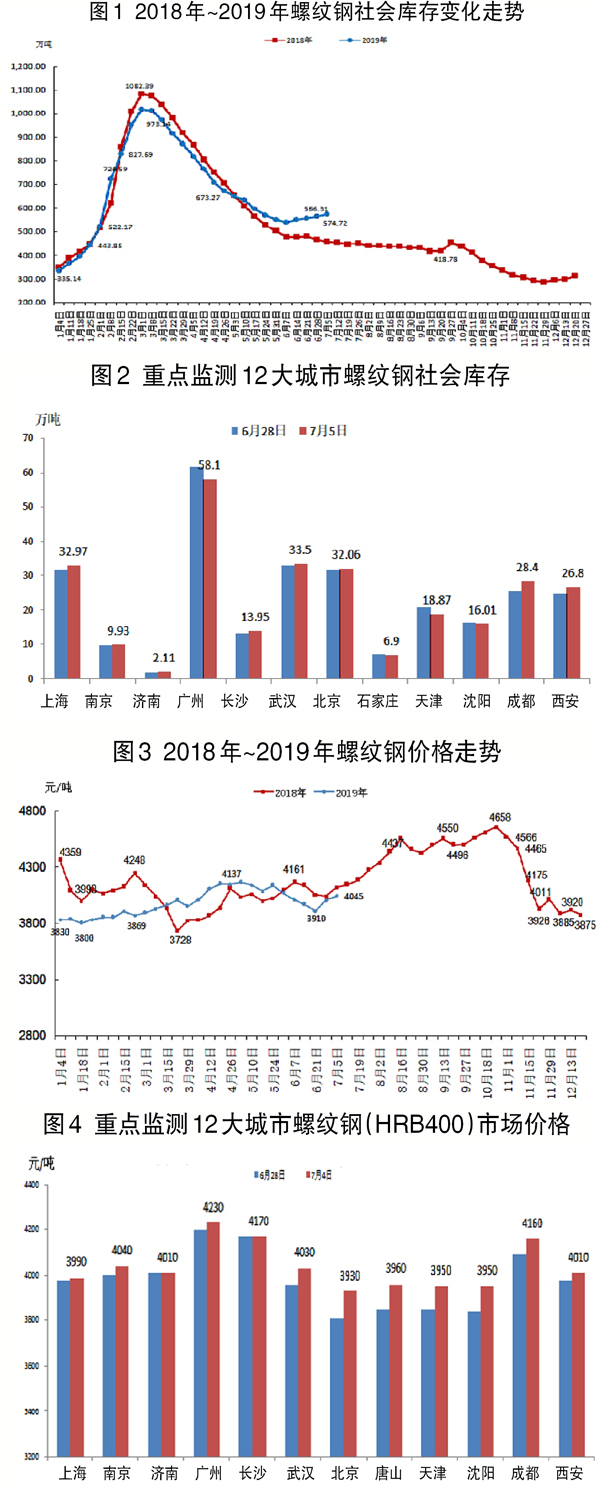 7月1日~7月5日,全國螺紋鋼平均價格為4045元/噸,環比上升43元/噸,升幅為1.07%。重點監測的12個城市除濟南、長沙外均上升,其中北京、唐山、沈陽等城市上升較大。