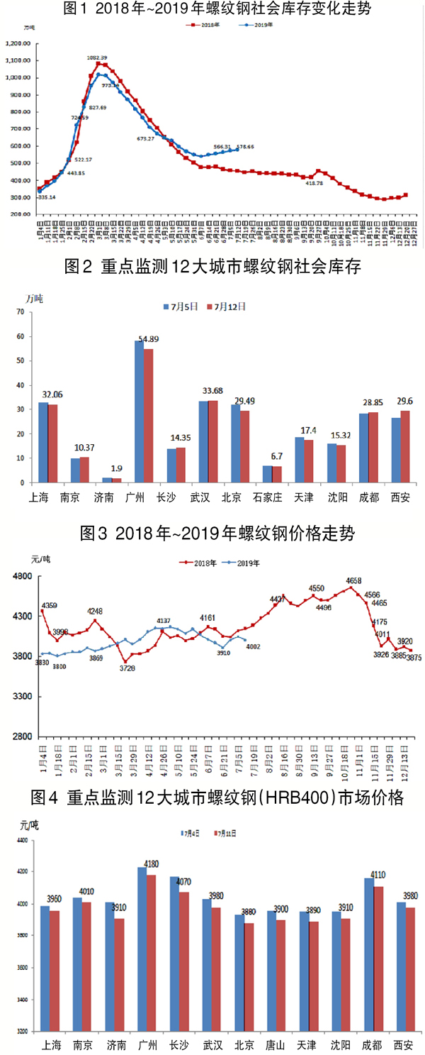 7月8日~7月12日,螺紋鋼社會(huì)庫(kù)存為578.66萬(wàn)噸,環(huán)比上升3.94萬(wàn)噸,升幅為0.68%。重點(diǎn)監(jiān)測(cè)的12個(gè)城市庫(kù)存升降不一,其中廣州、北京下降較大,西安上升較大。