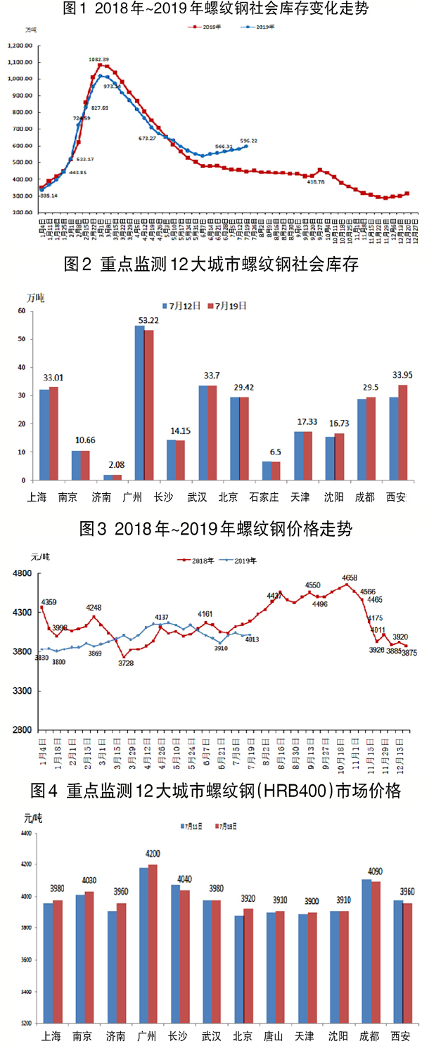 7月15日~7月19日,螺紋鋼社會庫存為596.22萬噸,環比上升17.56萬噸,升幅為2.95%。重點監測的12個城市庫存升降不一,其中廣州降幅較大,西安、沈陽升幅較大。