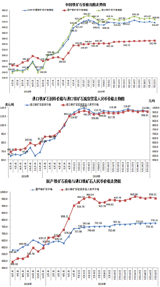 備注: 1.表列指數以1994年4月價格為100。 2.表列人民幣價格為含稅價格,進口鐵礦石到岸美元價格為不含稅價格。 3.表列國產鐵礦石為62%品位干基鐵精礦,進口鐵礦石為62%品位干基粉礦。