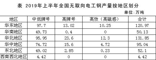 據中國金屬學會電工鋼分會數據,2019年上半年,我國共生產無取向電工鋼454.5萬噸,同比增長0.61%。其中,中低牌號無取向電工鋼產量為371.54萬噸,同比增長1.53%;高牌號無取向電工鋼產量為55.47萬噸,同比下降3.29%;高效(高磁感)無取向電工鋼產量為27.5萬噸,同比下降3.41%。今年上半年,無取向電工鋼市場產銷情況具體如何?后期需求走勢如何?本文帶您一窺究竟。