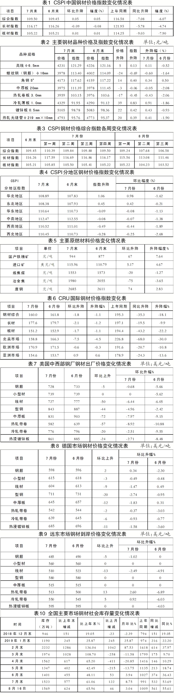 7月末,鋼協CSPI中國鋼材價格指數為109.50點,環比上升0.05點,升幅為0.05%,環比由降轉升;同比下降7.08點,降幅為6.07%。(見圖1)