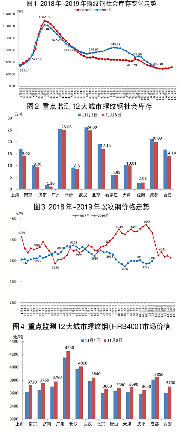 11月4日~11月8日,螺紋鋼社會庫存為343.10萬噸,環(huán)比下降29.07萬噸,降幅為7.81%。重點監(jiān)測的12個城市庫存升降不一,其中上海、西安等城市庫存降幅較大,沈陽有所上升。