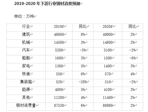 2019年鋼鐵行業市場需求較好,主要得益于基建、房地產等下游行業的穩定運行,但各行業發展情況并不相同,其中基建行業投資保持低速平穩增長,房地產投資、新開工保持較高速度增長,機械行業平穩運行,汽車行業持續低迷,造船行業三大指標兩降一升,家電行業保持增長趨勢,集裝箱行業陷入低迷,預計2019年鋼材消費量約8.8億噸,同比增長6%。