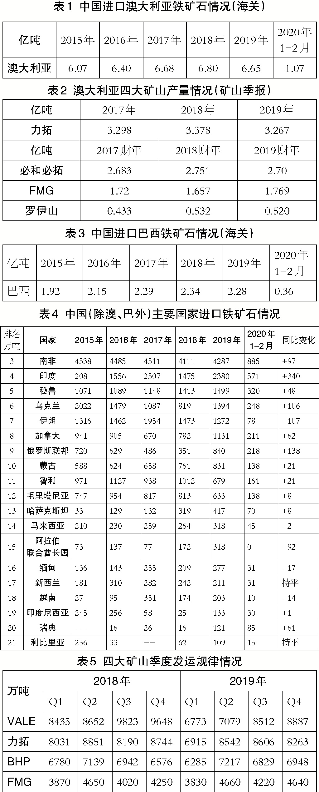 2019年,中國自澳大利亞進口鐵礦石6.65億噸,同比減少1500萬噸,占全年進口總量的62.21%(中國進口澳大利亞鐵礦石情況見表1,02版)。由于颶風天氣,2019年,澳大利亞四大礦山的產量受到不同程度的影響(澳大利亞四大礦山產量情況見表2,02版)。季報顯示,2019年,力拓皮爾巴拉地區鐵礦石產量為3.267億噸,同比減少1110萬噸。2019財年,必和必拓西澳鐵礦石產量為2.70億噸,同比減少510萬噸;FMG鐵礦石產量為1.769億噸,同比增加1120萬噸;羅伊山鐵礦石產量為5500萬噸,同比增加180萬噸。