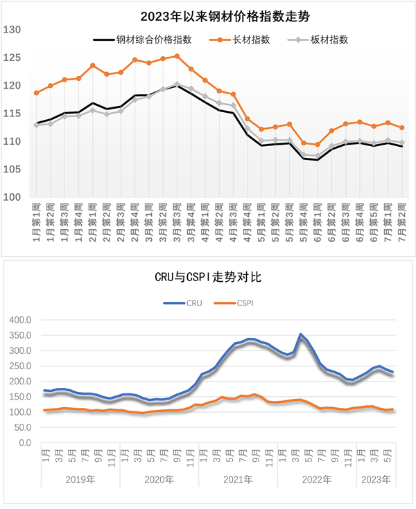7月14日,中國鋼材價格指數(CSPI)為109.11點,比上月末下降0.08點,降幅為0.07%;比去年底下降4.14點,降幅為3.66%;同比下降4.10點,降幅為3.62%。其中,長材價格指數為112.44點,比上月末下降0.25點,降幅為0.22%;同比下降5.74點,降幅為4.86%。板材價格指數為109.79點,比上月末下降0.09點,降幅為0.08%;同比下降3.00點,降幅為2.66%。從同比數據來看,長材價格指數降幅大于板材價格指數降幅2.74個百分點。