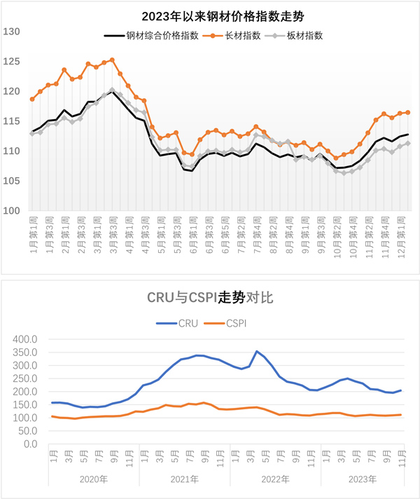 12月11日—12月15日當(dāng)周,國內(nèi)鋼材價(jià)格指數(shù)小幅上漲,長材價(jià)格指數(shù)有所上漲,板材價(jià)格指數(shù)小幅上漲。