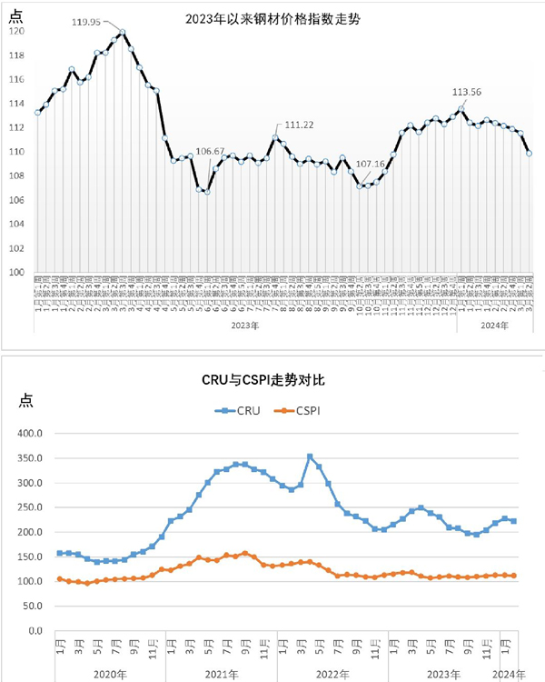當周,中國鋼材價格指數(CSPI)為109.90點,周環比下降1.68點,降幅為1.50%;比上月末下降2.02點,降幅為1.80%;比去年底下降3.00點,降幅為2.66%;同比下降9.40點,降幅為7.88%。其中,長材價格指數為111.63點,周環比下降2.63點,降幅為2.30%;比上月末下降3.14點,降幅為2.74%;比去年底下降4.48點,降幅為3.86%;同比下降13.17點,降幅為10.55%。板材價格指數為108.85點,周環比下降1.70點,降幅為1.54%;比上月末下降2.01點,降幅為1.81%;比去年底下降2.95點,降幅為2.64%;同比下降10.47點,降幅為8.77%。
