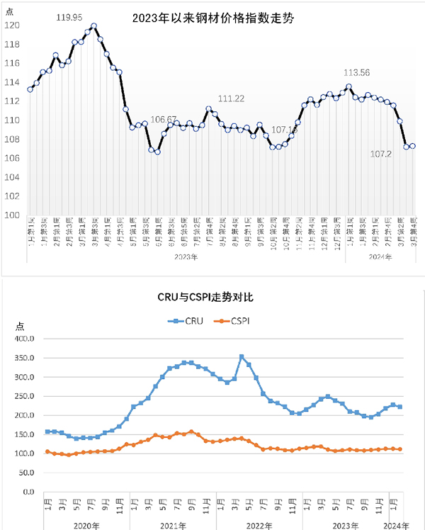 從國際市場來看,2024年2月份,CRU國際鋼材價格指數為222.7點,環比下降5.2點,降幅為2.3%,環比連續3個月回升后出現下降;比去年底上漲4.0點,漲幅為1.8%;同比下降4.5點,降幅為2.0%。其中,CRU長材價格指數為217.4點,環比下降1.4點,降幅為0.6%;同比下降27.5點,降幅為11.2%。CRU板材價格指數為225.3點,環比下降6.9點,降幅為3.0%;同比上漲6.9點,漲幅為3.2%。分地區來看,2024年2月份,北美地區價格指數為266.6點,環比下降23.0點,降幅為7.9%;歐洲地區價格指數為246.2點,環比上漲9.6點,漲幅為4.1%;亞洲地區價格指數為183.9點,環比下降3.0點,降幅為1.6%。