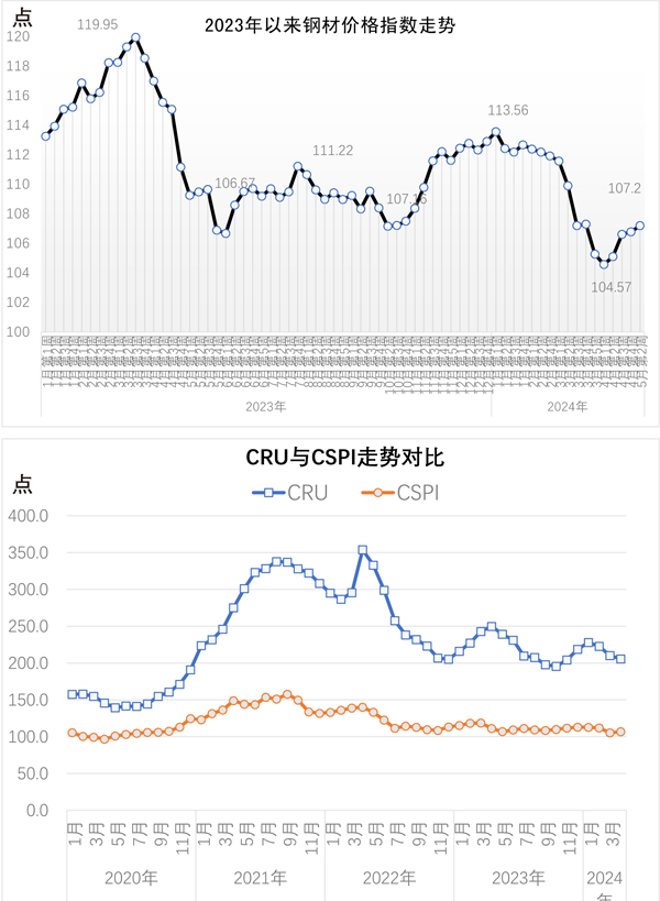 當(dāng)周,中國(guó)鋼材價(jià)格指數(shù)(CSPI)為107.20點(diǎn),周環(huán)比上漲0.42點(diǎn),漲幅為0.40%;比上月末上漲0.42點(diǎn),漲幅為0.40%;比去年底下降5.70點(diǎn),降幅為5.05%;同比下降2.05點(diǎn),降幅為1.88%。其中,長(zhǎng)材價(jià)格指數(shù)為110.28點(diǎn),周環(huán)比上漲0.88點(diǎn),漲幅為0.80%;比上月末上漲0.88點(diǎn),漲幅為0.80%;比去年底下降5.83點(diǎn),降幅為5.02%;同比下降1.88點(diǎn),降幅為1.68%。板材價(jià)格指數(shù)為105.16點(diǎn),周環(huán)比上漲0.18點(diǎn),漲幅為0.18;比上月末上漲0.18點(diǎn),漲幅為0.17%;比去年底下降6.64點(diǎn),降幅為5.94%;同比下降4.95點(diǎn),降幅為4.50%。