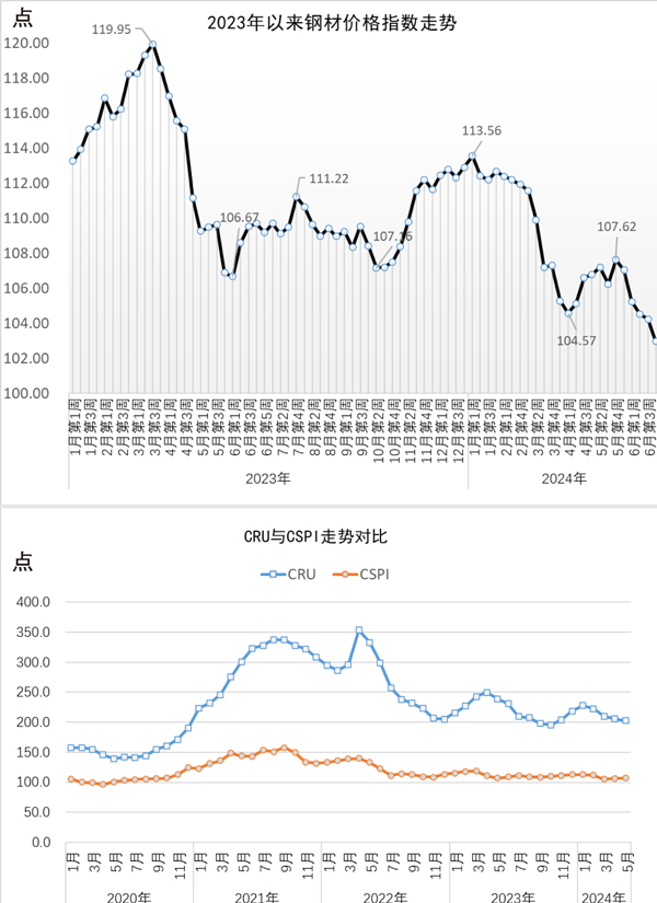 當周,中國鋼材價格指數(CSPI)為102.96點,周環比下降1.27點,降幅為1.22%;比上月末下降4.07點,降幅為3.80%;比去年底下降9.94點,降幅為8.80%;同比下降6.23點,降幅為5.71%。其中,長材價格指數為105.20點,周環比下降1.72點,降幅為1.61%;比上月末下降5.71點,降幅為5.15%;比去年底下降10.91點,降幅為9.40%;同比下降7.49點,降幅為6.65%。板材價格指數為101.30點,周環比下降1.02點,降幅為0.99%;比上月末下降3.21點,降幅為3.07%;比去年底下降10.50點,降幅為9.39%;同比下降8.40點,降幅為7.66%。