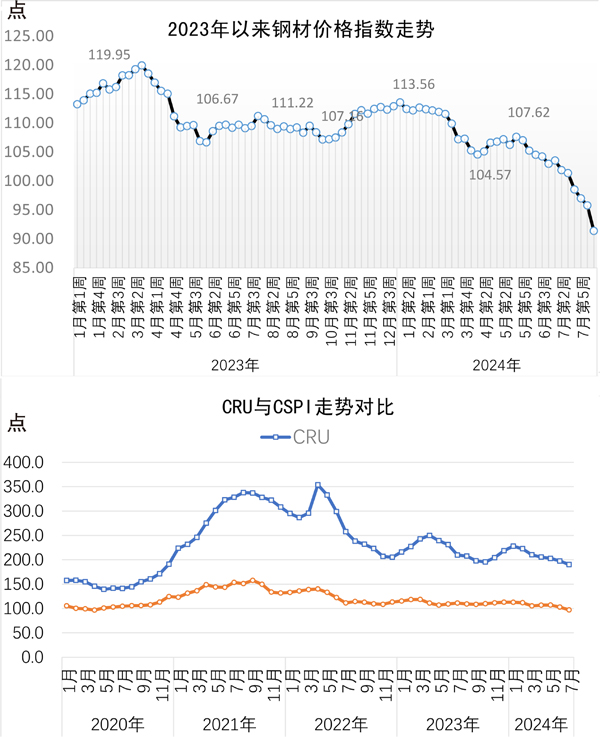 當周,中國鋼材價格指數(CSPI)為91.38點,周環比下降4.41點,降幅為4.61%;比上月末下降5.62點,降幅為5.79%;比去年底下降21.52點,降幅為19.06%;同比下降17.60點,降幅為16.15%。其中,長材價格指數為93.58點,周環比下降3.69點,降幅為3.79%;比上月末下降4.77點,降幅為4.85%;比去年底下降22.53點,降幅為19.40%;同比下降17.46點,降幅為15.72%。板材價格指數為88.98點,周環比下降5.27點,降幅為5.59%;比上月末下降6.59點,降幅為6.90%;比去年底下降22.82點,降幅為20.41%;同比下降22.24點,降幅為20.00%。