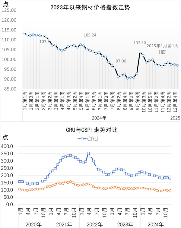 2024年12月30日—2025年1月3日當周,國內鋼材價格指數環比小幅下降。長材價格指數、板材價格指數均小幅下降,長材價格指數降幅小于板材價格指數降幅。