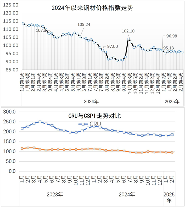 從國際市場來看,2025年2月份,CRU國際鋼材價格指數為184.9點,環比上漲6.6點,漲幅為3.7%;比去年底上漲4.3點,漲幅為2.4%;同比下降37.8點,降幅為17.0%。其中,CRU長材價格指數為196.9點,環比上漲2點,漲幅為1%;比去年底上漲0.7點,漲幅為0.4%;同比下降20.5點,降幅為9.4%。CRU板材價格指數為179點,環比上漲9點,漲幅為5.3%;比去年底上漲6.2點,漲幅為3.6%;同比下降46.3點,降幅為20.6%。分地區來看,2月份,北美地區鋼材價格指數為212.4點,環比上漲8.8點,漲幅為4.3%,同比下降54.2點,降幅為20.3%;歐洲地區鋼材價格指數為212.1點,環比上漲10.6點,漲幅為5.3%,同比下降34.1點,降幅為13.9%;亞洲地區鋼材價格指數為153.7點,環比上漲3.2點,漲幅為2.1%,同比下降30.2點,降幅為16.4%。