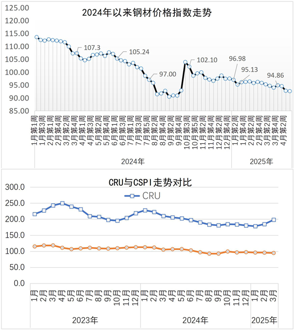當周,中國鋼材價格指數(CSPI)為92.58點,周環比下降0.14點,降幅為0.15%;比上月末下降2.28點,降幅為2.40%;比去年底下降4.89點,降幅為5.02%;同比下降14.03點,降幅為13.16%。其中,長材價格指數為93.90點,周環比下降0.15點,降幅為0.15%;比上月末下降2.42點,降幅為2.51%;比去年底下降6.32點,降幅為6.31%;同比下降15.21點,降幅為13.94%。板材價格指數為91.22點,周環比下降0.12點,降幅為0.13%;比上月末下降2.19點,降幅為2.34%;比去年底下降4.33點,降幅為4.53%;同比下降13.66點,降幅為13.02%。