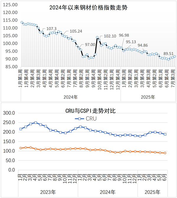 當周,鋼材價格指數繼續小幅上漲。需求方面,高溫多雨天氣導致部分項目施工受阻,需求釋放有限。供給方面,隨著國家“反內卷”政策信號愈發明顯,市場控產預期增強。成本方面,近期焦煤、焦炭等原燃料價格止跌回升。總體來看,短期內鋼材市場以震蕩偏強為主。