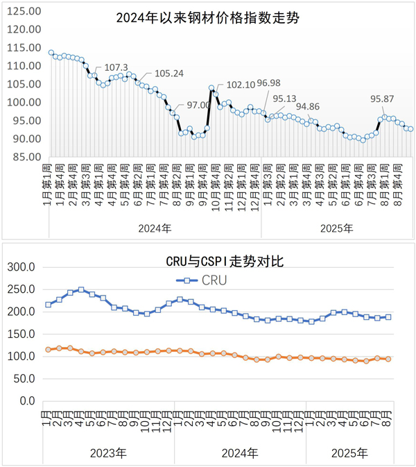 當(dāng)周,中國(guó)鋼材價(jià)格指數(shù)(CSPI)為92.61點(diǎn),周環(huán)比下降0.15點(diǎn),降幅為0.16%;比上月末下降1.41點(diǎn),降幅為1.50%;比去年底下降4.86點(diǎn),降幅為4.99%;同比上漲1.71點(diǎn),漲幅為1.88%。其中,長(zhǎng)材價(jià)格指數(shù)為93.30點(diǎn),周環(huán)比下降0.13點(diǎn),降幅為0.14%;比上月末下降1.83點(diǎn),降幅為1.92%;比去年底下降6.92點(diǎn),降幅為6.90%;同比下降2.12點(diǎn),降幅為2.22%。板材價(jià)格指數(shù)為91.63點(diǎn),周環(huán)比下降0.16點(diǎn),降幅為0.17%;比上月末下降1.26點(diǎn),降幅為1.36%;比去年底下降3.92點(diǎn),降幅為4.10%;同比上漲4.30點(diǎn),漲幅為4.92%。