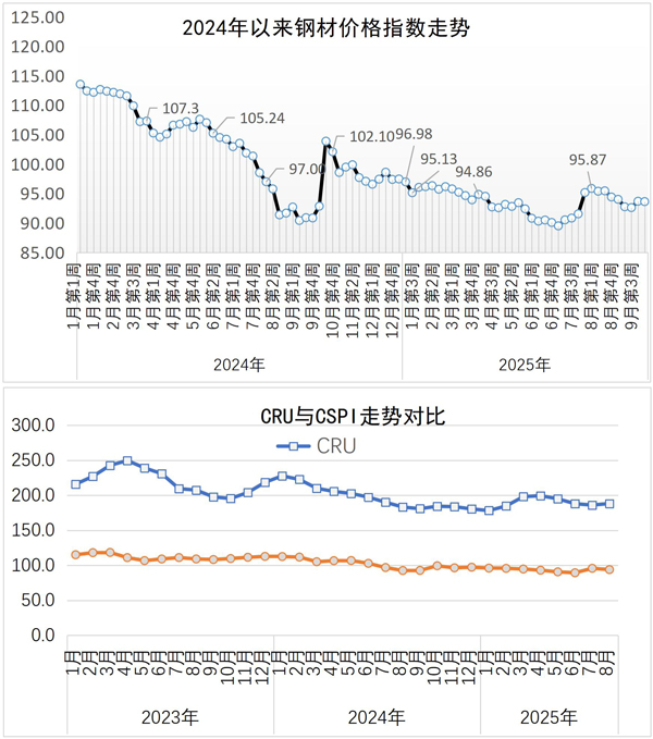 9月22日—26日,國內(nèi)鋼材價(jià)格指數(shù)環(huán)比略有下降。當(dāng)周,中國鋼材價(jià)格指數(shù)(CSPI)為93.63點(diǎn),周環(huán)比下降0.06點(diǎn),降幅為0.06%;比上月末下降0.39點(diǎn),降幅為0.41%;比去年底下降3.84點(diǎn),降幅為3.94%;同比上漲0.78點(diǎn),漲幅為0.84%。其中,長材價(jià)格指數(shù)為94.16點(diǎn),周環(huán)比上漲0.18點(diǎn),漲幅為0.19%;比上月末下降0.97點(diǎn),降幅為1.02%;比去年底下降6.06點(diǎn),降幅為6.05%;同比下降3.61點(diǎn),降幅為3.69%。板材價(jià)格指數(shù)為92.83點(diǎn),周環(huán)比下降0.19點(diǎn),降幅為0.20%;比上月末下降0.06點(diǎn),降幅為0.06%;比去年底下降2.72點(diǎn),降幅為2.85%;同比上漲3.48點(diǎn),漲幅為3.89%。