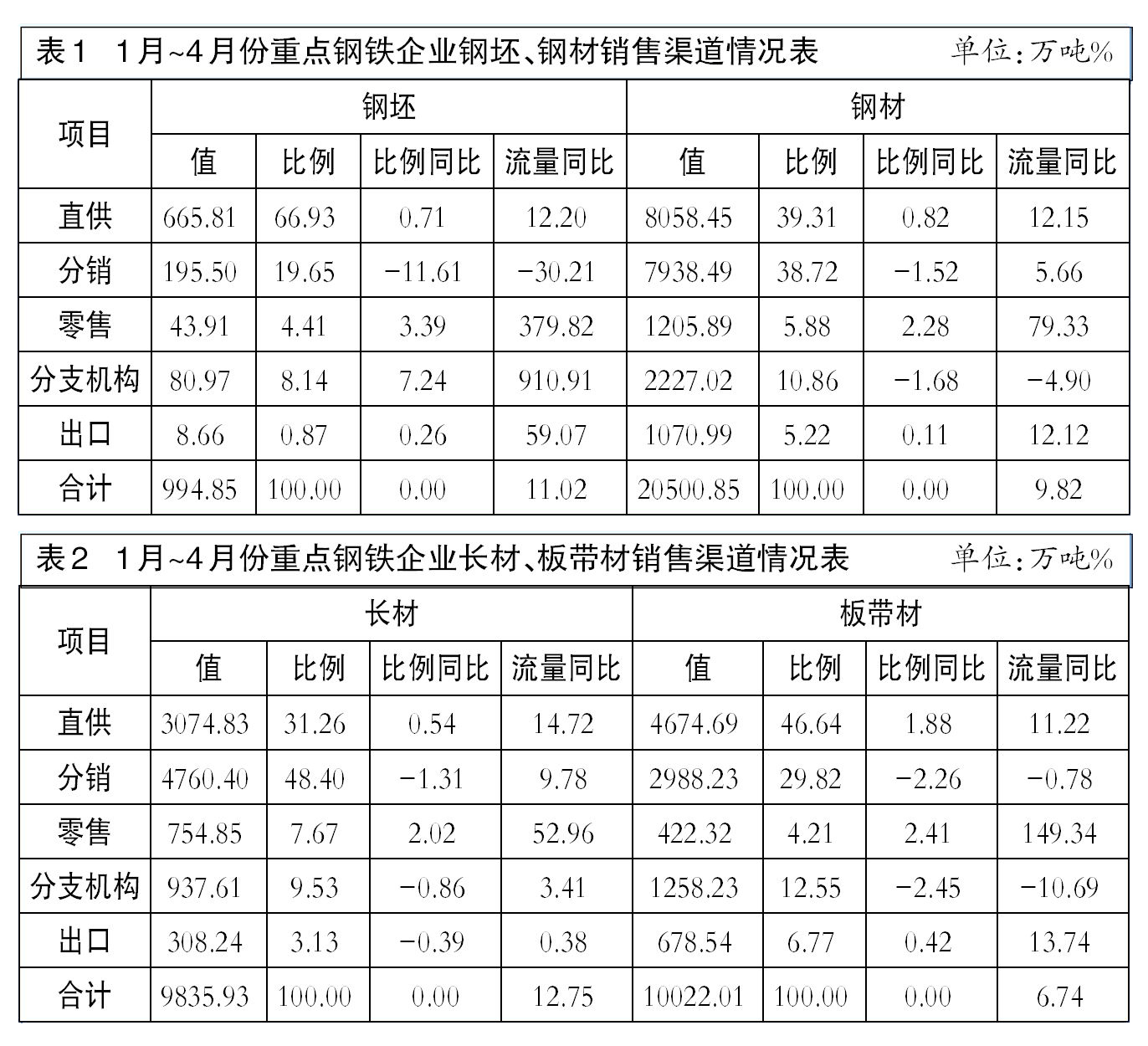 1月~4月份,重點鋼鐵企業(yè)長材按銷售渠道占比大小排序依次是:分銷、直供、分支機構、零售、出口。與2018年1月~4月份相比,長材零售占比提高最大,提高了2.02個百分點;分銷占比下降最大,下降了1.31個百分點。1月~4月份,長材銷售量中零售增幅最大,同比上升52.96%。