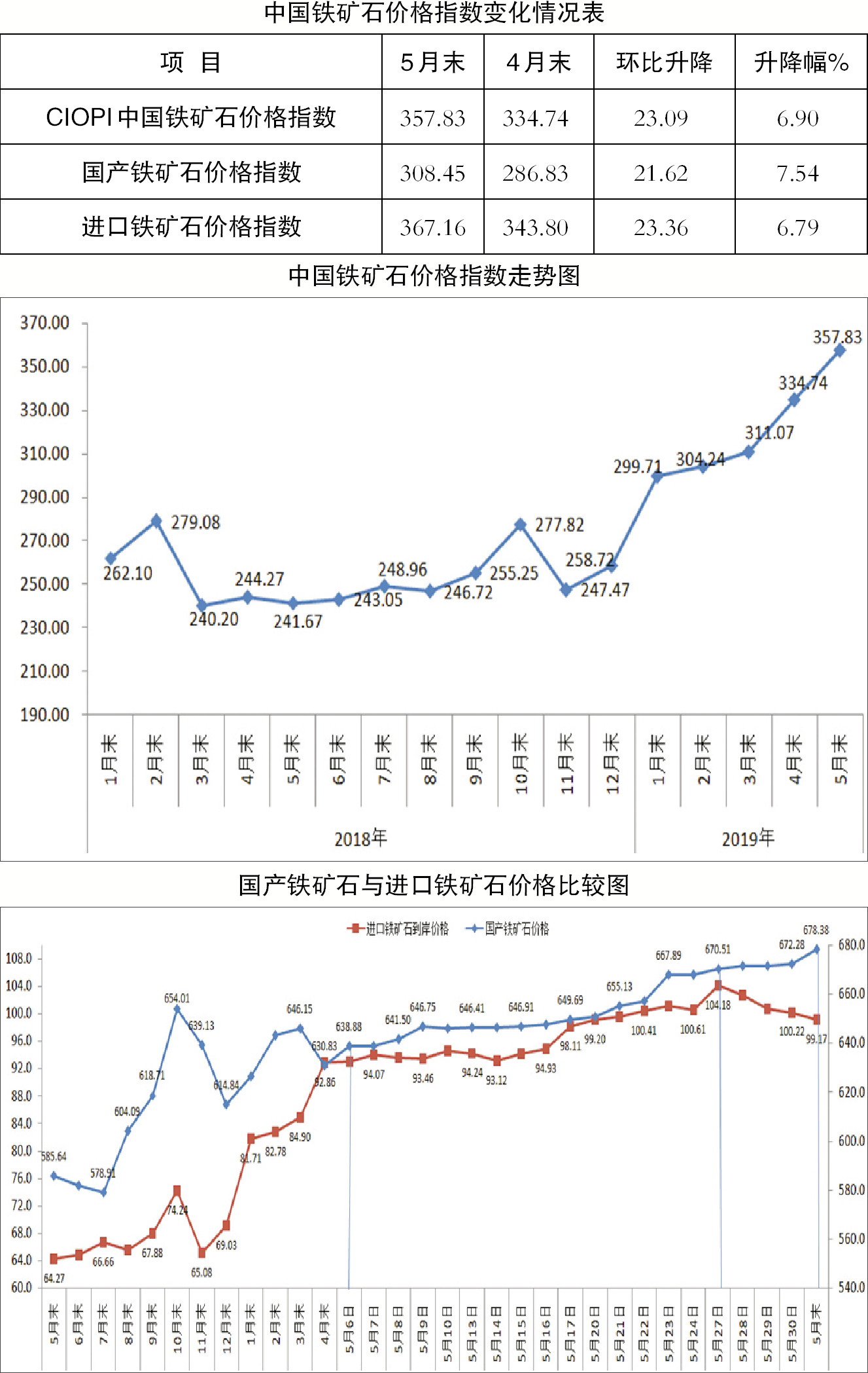 據中國鋼鐵工業協會監測,5月末,中國鐵礦石價格指數(CIOPI)為357.83點,環比上升23.09點,升幅為6.90%。其中,國產鐵礦石價格指數為308.45點,環比上升21.62點,升幅為7.54%;進口鐵礦石價格指數為367.16點,環比上升23.36點,升幅為6.79%。