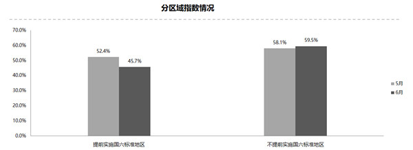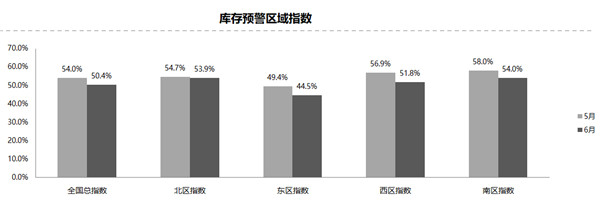 從區(qū)域指數(shù)情況看:6月全國總指數(shù)為50.4%,北區(qū)指數(shù)為53.9%,東區(qū)指數(shù)為44.5%,南區(qū)指數(shù)為54.0%,西區(qū)指數(shù)為51.8%。由于東區(qū)包含省份均為提前實施國六標(biāo)準(zhǔn)的省份,經(jīng)銷商加大促銷力度,清國五車庫存,導(dǎo)致庫存預(yù)警指數(shù)下降幅度最大,已達到警戒線以下。