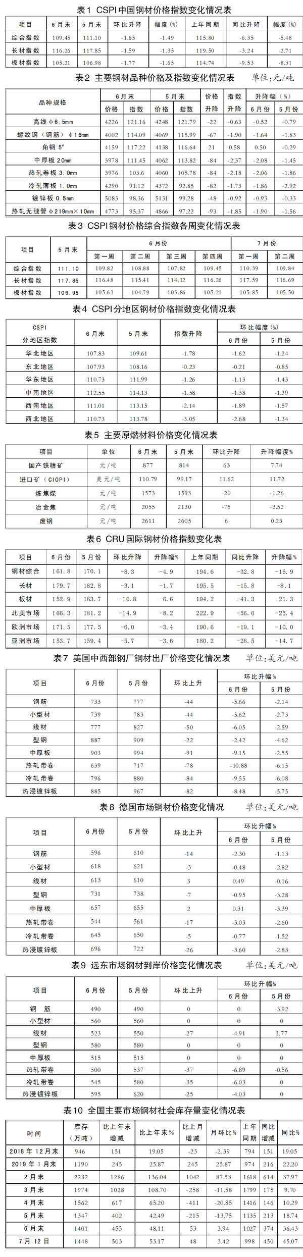 各周鋼材價格指數(shù)變化情況。6月份,CSPI國內(nèi)鋼材價格指數(shù)在前三周持續(xù)小幅下降,第四周有所回升。進入7月份,CSPI國內(nèi)鋼材價格指數(shù)在第一周繼續(xù)上升,第二周小幅回落。(見表3)