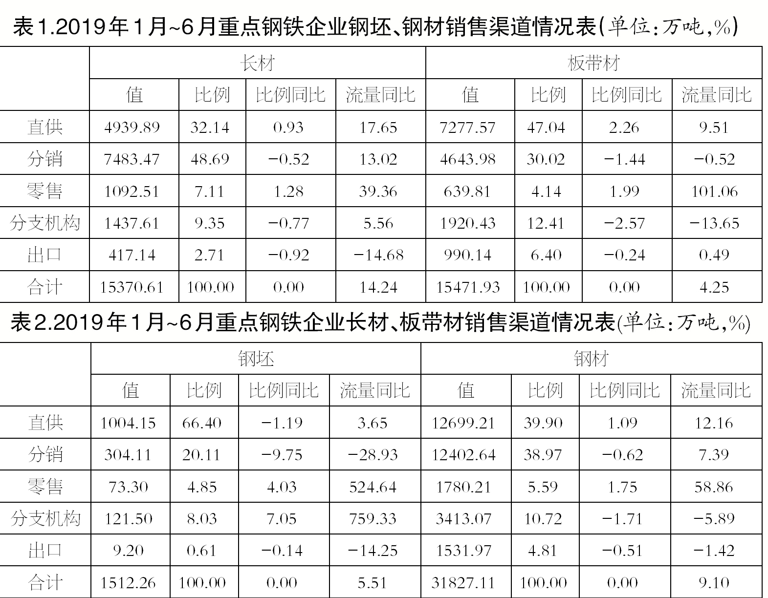 1月~6月,重點鋼鐵企業長材按銷售渠道占比大小排序依次是:分銷、直供、分支機構、零售、出口。與2018年同期相比,長材零售占比提高最大,提高了1.28個百分點;出口占比減少最大,減少了0.92個百分點。長材銷售量與2018年同期相比,零售增幅最大,上升39.36%。