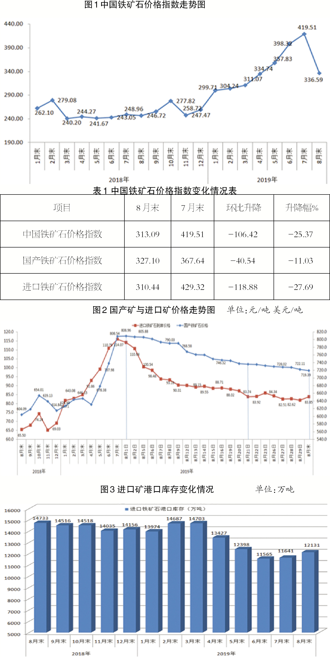據中國鋼鐵工業協會監測,8月末,中國鐵礦石價格指數(CIOPI)為313.09點,環比下降106.42點,降幅為25.37%,環比由升轉降。其中,國產鐵礦石價格指數為327.10點,環比下降40.54點,降幅為11.03%;進口鐵礦石價格指數為310.44點,環比下降118.88點,降幅為27.69%。