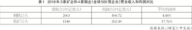 表1從《財富》(中文版)2018年全球500強企業中選取了以鐵礦石為核心業務的3家礦業公司(力拓、必和必拓、淡水河谷)和4家盈利能力最強的鋼鐵企業(安賽樂米塔爾、浦項制鐵、日本制鐵、JFE),把它們的年營業收入和年利潤合并后做對比。從表1中可知,2018年,鋼鐵巨頭的營業收入幾乎是鐵礦巨頭的兩倍,而利潤則僅為鐵礦巨頭的一半,平均利潤率還不到鐵礦巨頭的1/3。需要說明的是多數鋼鐵巨頭都會通過鋼鐵主業之外的多元化投資來提升盈利水平。這種投資既有對下游產業,如汽車零部件產業的投資;也有對上游產業,如鐵礦業的投資。比如,安賽樂米塔爾有一個龐大的礦業部門,它控制的鐵礦石產能在全球鋼鐵企業居第一位。這使安賽樂米塔爾的平均利潤率明顯高于同行。而鐵礦巨頭的多元業務則涉及其他礦物的勘探、開發和開采,如銅礦、鋁礦、鎳礦和煤礦等。但在多數年份,鐵礦業務是它們的利潤支柱。根據2019年上半年的財報,力拓的息稅折舊攤銷前利潤(EBITDA)率為47%,而它的主要業務單元皮爾巴拉鐵礦石業務的EBITDA利潤率為72%,遠高于其他業務部門。