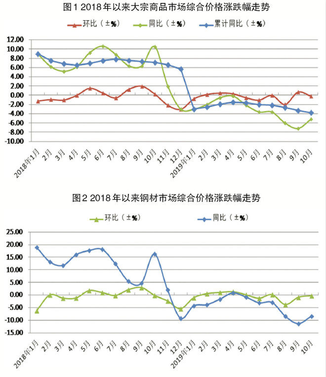 10月份,受需求旺季的影響,國內(nèi)大宗商品市場形勢繼續(xù)向好,行業(yè)經(jīng)營狀況有所好轉(zhuǎn)。不過,由于國內(nèi)宏觀經(jīng)濟下行壓力仍在加大、國際貿(mào)易局勢仍不穩(wěn)定,大宗商品市場回暖的力度不及往年同期。大宗商品供應(yīng)端的增速明顯快于需求端,導(dǎo)致市場供給壓力加大,庫存持續(xù)增長,市場價格未能延續(xù)9月份的回升走勢。10月份,大宗商品市場價格環(huán)比下跌0.2%,同比下跌5.2%。1月~10月份,大宗商品市場累計平均價格同比下降3.7%,降幅比1月~9月份擴大0.4個百分點。
