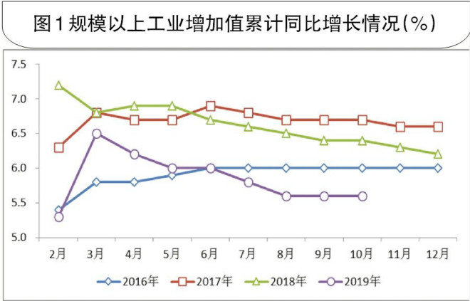 10月份,規模以上工業增加值同比增長4.7%,環比回落1.1個百分點。其中,采礦業增加值同比增長3.9%,增速環比回落4.2個百分點;制造業增加值同比增長4.6%,增速環比回落1.0個百分點,表明工業整體下行壓力仍然較大。1月~10月份,規模以上工業增加值同比增長5.6%,增速比去年同期回落0.8個百分點。其中,采礦業增加值同比增長4.5%,增速比去年同期加快2.5個百分點;制造業增加值同比增長5.8%,增速比去年同期回落0.8個百分點;電力、熱力、燃氣及水生產和供應業增加值同比增長7.0%,增速比去年同期回落3.0個百分點。自今年第一季度以來,工業經濟下行壓力逐步增大。