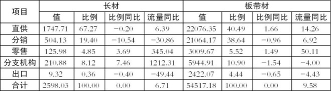 表2 1月~8月份重點(diǎn)鋼企長(zhǎng)材、板帶材銷售渠道情況表(單位:萬噸,%)