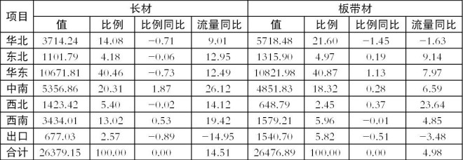 表1 1月~10月份重點(diǎn)鋼鐵企業(yè)長(zhǎng)材、板帶材區(qū)域流量(單位:萬噸 %)