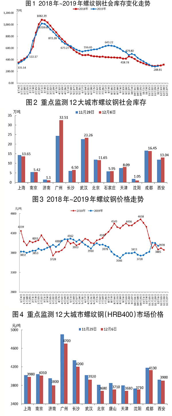 12月2日~12月6日,螺紋鋼社會庫存為288.81萬噸,環(huán)比上升5.57萬噸,升幅為1.97%。重點監(jiān)測的12個城市庫存升降不一,其中沈陽、上海等城市庫存降幅較大,廣州等城市庫存升幅較大。