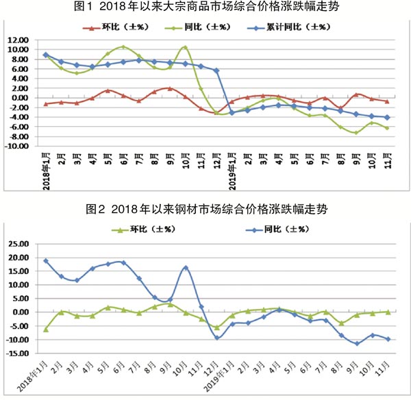 11月份,國內大宗商品市場運行良好,供需聯動增長,但供應端增速仍然快于需求端,庫存上升。在此背景下,11月份,大宗商品市場價格延續10月份的下降走勢,環比下跌0.7%,降幅環比擴大0.5個百分點;同比下跌6.2%,降幅環比擴大1.0個百分點。1月~11月份,國內大宗商品累計平均價格比去年同期下降4.0%。