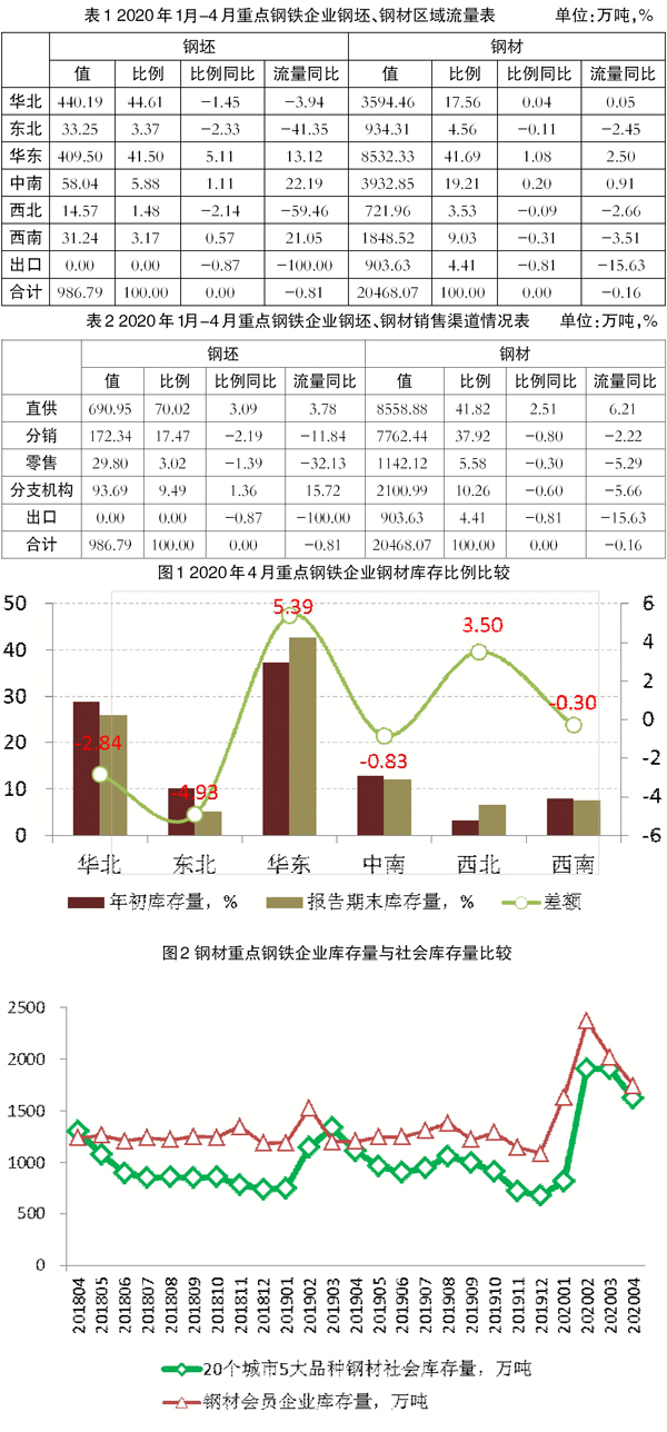 1月~4月份,重點鋼鐵企業鋼材按銷售渠道占比大小排序依次是:直供、分銷、分支機構、零售、出口。同2019年1月~4月份相比,鋼材直供占比提高最大,提高了2.51個百分點,出口占比下降最大,下降了0.81個百分點。鋼材銷售量同2019年1月~4月份相比,出口降幅最大,下降15.63%。