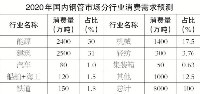 2019年我國鋼材消費量約為8.75億噸,根據世界鋼鐵協會6月初發布的“中國2020年鋼鐵需求量將增長1.0%”預測,可測算出2020年我國鋼材需求量為8.8億噸。關于2020年鋼管市場需求量的評估,有3種思路:第一種是假設鋼管需求量占鋼材需求量的8%(4月份是7.48%),則鋼管需求量為7000萬噸;第二種是設定鋼管需求同比增長率為-8.0%(2019年鋼管需求量為8400萬噸),則鋼管需求量為7700萬噸;第三種是根據截至4月底鋼管累計產量的月平均數,折成全年鋼管需求量為6800萬噸。考慮到疫后補償性需求釋放,筆者認為上述三種思路略偏于保守,故評估2020年我國鋼管市場需求量為8000萬噸左右,其中無縫鋼管約為3000萬噸,焊管約為5000萬噸。具體分行業需求量預測如表。