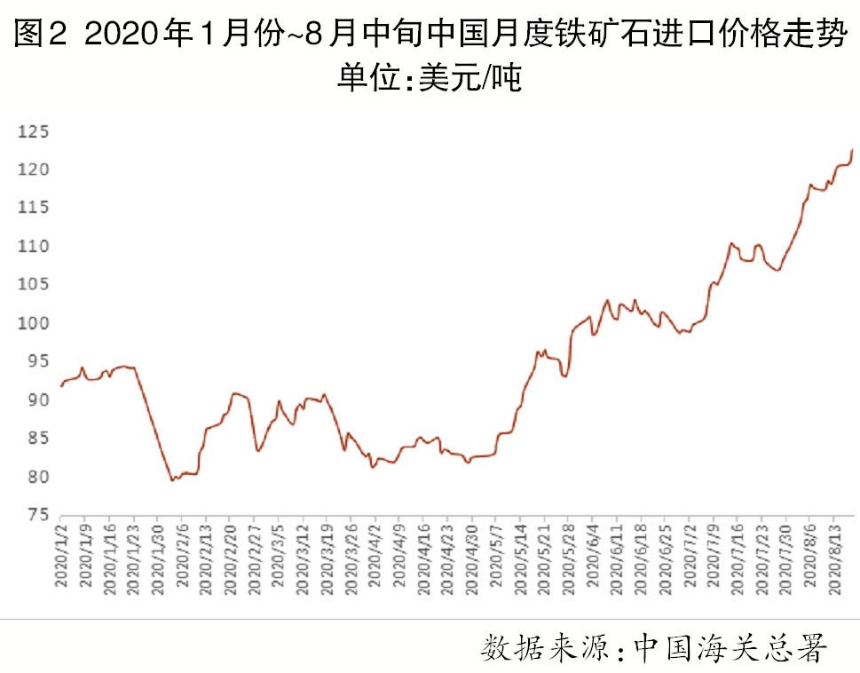 中國海關總署統計數據顯示,8月份,中國進口鐵礦石10036萬噸,月平均進口單價為103.4美元/噸,環比提高6.5%。1月~8月份,中國鐵礦石累計進口量達到75991.5萬噸,累計進口金額為706億美元,累計平均進口單價為92.9美元/噸。自2019年3月份以來,我國鐵礦石月平均進口價格呈逐月上升態勢,即便是在新冠肺炎疫情期間也趨勢未改。鐵礦石與黃金一道,加入最能夠成功規避新冠肺炎疫情影響的大宗商品品種行列。