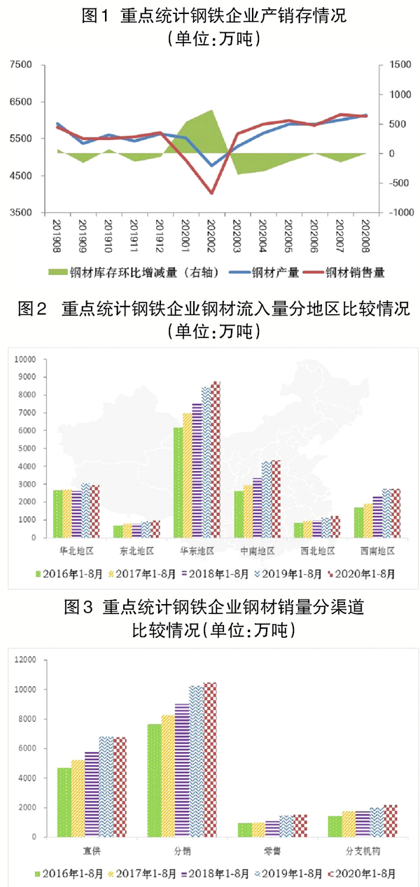 1月~8月份,重點統計鋼鐵企業同2019年1月~8月份相比,國內鋼材銷售量的增幅大于鋼材產量的增幅,表明重點統計鋼鐵企業增產的鋼材在國內市場得到了消化,同時國內市場還消化了一部分出口轉內銷的鋼材和一部分鋼材庫存。