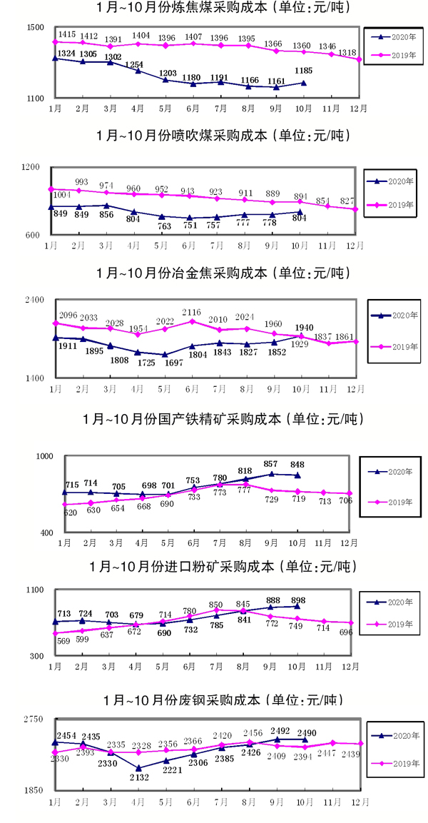 1月~10月份,煉焦煤累計(jì)采購(gòu)成本同比下降11.95%;冶金焦同比下降8.78%;國(guó)產(chǎn)鐵精礦同比升高8.61%,進(jìn)口粉礦同比升高6.34%;廢鋼同比下降0.41%。