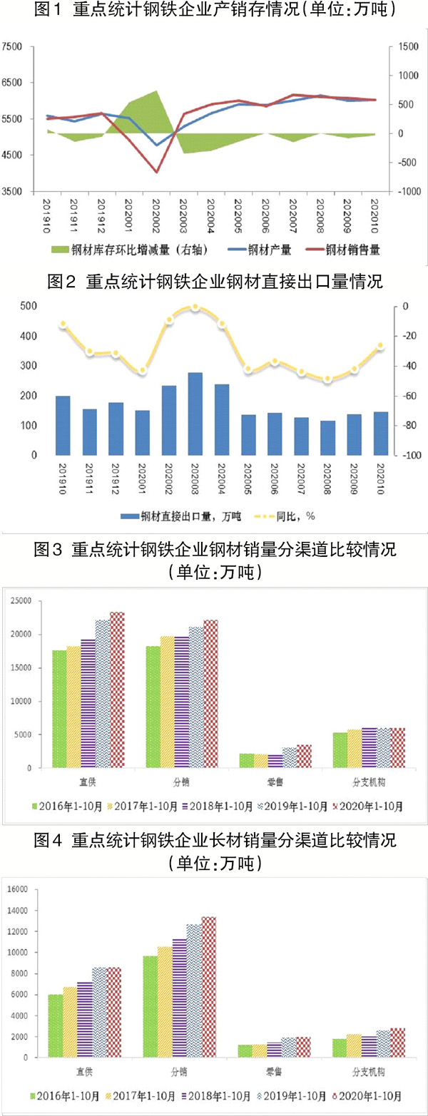 分銷售渠道看,1月~10月份,重點統計鋼鐵企業同去年1月~10月份相比,鋼材直供銷量增長幅度較大。其中板帶材直供銷量大幅上升,且上升幅度大于整個鋼材直供銷量的上升幅度,表明重點統計鋼鐵企業加大了對板帶材用戶的服務力度,進一步擴大了板帶材直供渠道的占比。