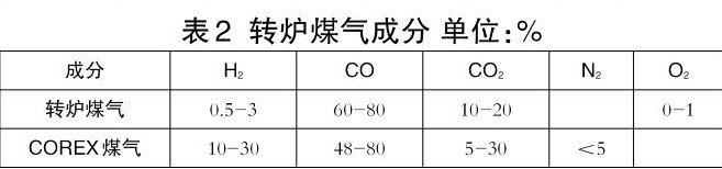 轉爐煤氣制氫。轉爐煉鋼系統(tǒng)產(chǎn)生的煤氣經(jīng)降溫、除塵后,進入水煤氣變換裝置中,在催化劑的作用下,發(fā)生水煤氣變換反應。反應后,經(jīng)冷卻、分離,獲得富含氫氣的混合氣體。混合氣體經(jīng)脫硫后,采用變壓吸附制氫法,獲得高純度氫氣。轉爐煤氣成分見表2。