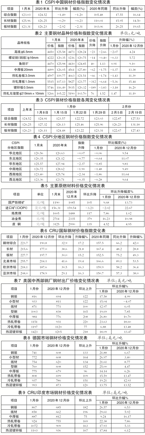 1月份,由于天氣轉冷,加上新一輪的疫情防控措施和臨近春節假期等因素影響,國內市場鋼材需求強度有所減弱。1月份,中國制造業PMI(采購經理指數)為51.3%,環比回落0.6個百分點,但連續11個月位于臨界點以上;CPI(消費者物價指數)同比下降0.3% 環比上漲1%;PPI(生產價格指數)同比上漲0.3% 環比上漲1%。1月末,廣義貨幣(M2)余額同比增長9.4%,增速比2020年12月末低0.7個百分點;狹義貨幣(M1)余額同比增長14.7%,增速比2020年12月末高6.1個百分點;流通中貨幣(M0)余額同比下降3.9%。受鋼材市場需求強度減弱影響,1月份鋼材價格小幅下降。