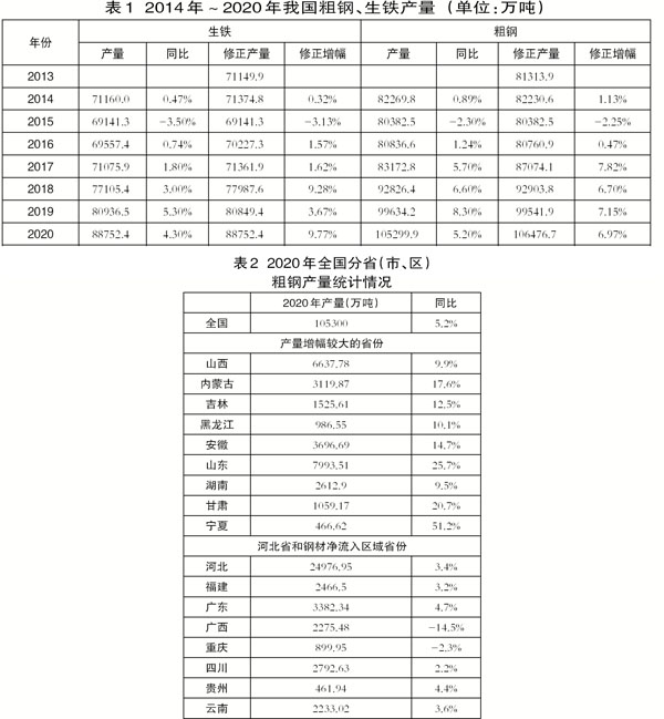 隨著鋼鐵需求的回暖,我國鋼產量似乎在過去3年時間里跨過了前期的產量峰值,重新恢復了增長態勢。2020年,我國粗鋼、生鐵產量分別同比增長7.0%、7.15%。2017年~2019年,國家統計局公布的粗鋼產量同比增長數據分別是5.7%、6.6%和8.3%,而經過修正后的實際增長率分別高達7.82%、6.70%和7.15%。換句話說,按照修正數據進行計算,我國2020年的粗鋼產量較2016年增長了31.84%!2021年前2個月,我國粗鋼產量更是達到1.75億噸,同比再度大幅增長12.9%。(見表1)