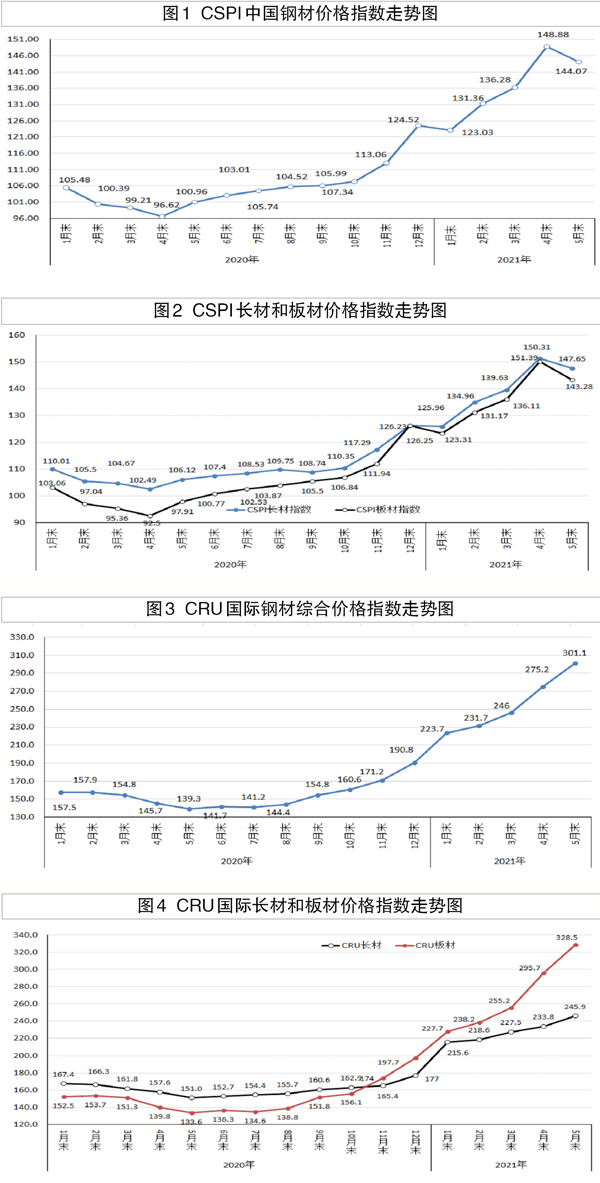 進(jìn)入5月份以來(lái),前兩周鋼材價(jià)格繼續(xù)上漲,CSPI綜合指數(shù)在5月14日沖上174.81點(diǎn),達(dá)歷史最高點(diǎn),比4月末上漲17.42%。針對(duì)鋼材價(jià)格上漲過快,國(guó)務(wù)院常務(wù)會(huì)議連續(xù)2次聚焦大宗商品價(jià)格問題,國(guó)家發(fā)改委、工信部、國(guó)資委等部委聯(lián)合開展約談和市場(chǎng)監(jiān)管稽查。5月份第三周、第四周鋼材價(jià)格出現(xiàn)持續(xù)回落走勢(shì),至5月末,CSPI綜合指數(shù)降至144.07點(diǎn),比高點(diǎn)回落35.49點(diǎn),跌幅為19.76%,已低于4月末水平;環(huán)比下降4.81點(diǎn),降幅為3.23%。(見圖1)
