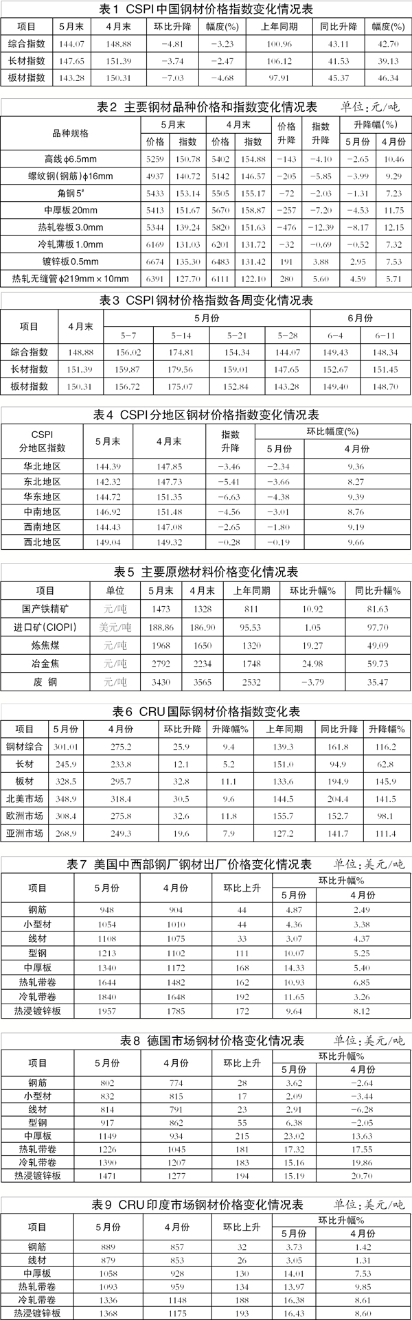 5月份,國(guó)內(nèi)市場(chǎng)鋼材價(jià)格大幅震蕩。5月份前兩周鋼材價(jià)格快速攀升,CSPI綜合指數(shù)在第二周升至歷史新高;后兩周又出現(xiàn)大幅回落,5月末已低于4月末水平。進(jìn)入6月份以來(lái),鋼材價(jià)格呈窄幅波動(dòng)走勢(shì)。