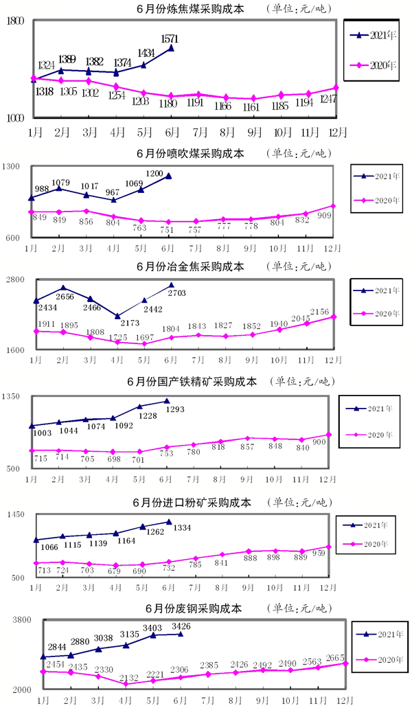 6月份,主要原燃料采購成本繼續大幅增長,煤焦類產品采購成本環比增長普遍在10%以上,鐵礦石采購成本增長也普遍超過了5%。