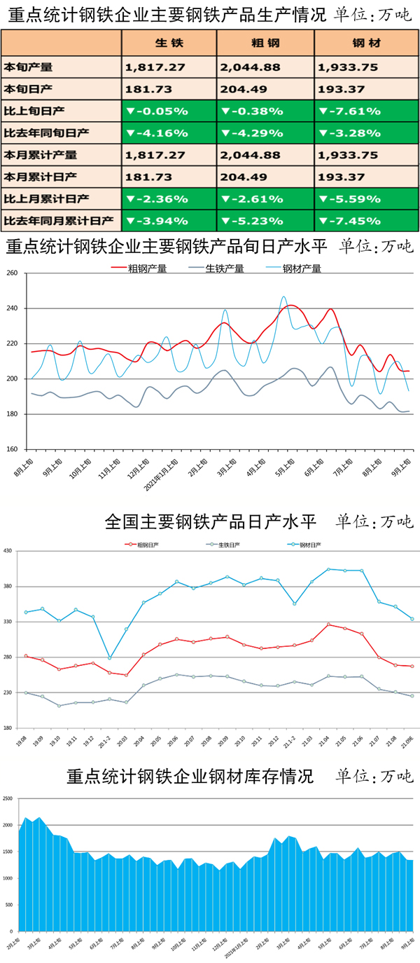 根據重點統計鋼鐵企業產量估算,9月上旬,全國共生產粗鋼2674.87萬噸、生鐵2250.18萬噸、鋼材3337.8萬噸。其中,粗鋼日產267.49萬噸、環比下降0.64%,生鐵日產225.02萬噸、環比下降0.04%,鋼材日產333.78萬噸、環比下降3.68%(本旬依據國家統計局8月份數據,對前期相關估算數進行了調整)。